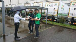 14日(火)には、通勤事故防止の活動として、出勤してきた社員に対しチラシ配布を実施しています。