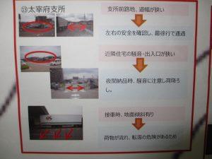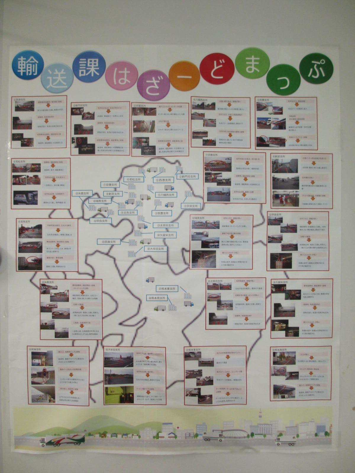 鳥栖流通センター輸送課では、先日ご紹介した内容に加え、交通安全特別強化月間の取り組みを実施しています。乗務員へのヒアリングをもとに宅配納品先のハザードマップを更新し、「過去に発生させている施設破損事故の場所」や「納品時に接車が困難なセンター(新人乗務員の事故抑制のため)」、「夜間納品時の騒音クレーム注意箇所」が一目で分かるよう、運行管理者が作成しました。