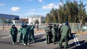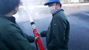避難訓練では、破材処理室での火災を想定し順次避難を行いました。避難の際には過去の指摘事項を取り入れ、ハンカチなどで鼻・口元を塞ぐように注意喚起を行い、安全かつ迅速に避難できるように誘導を行いました。消火訓練では代表で選抜された8人が参加し、放水訓練を行いました。