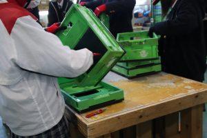 参加した8人の生徒たちは、当社の生活相談員の案内で、庫内での物の流れやオリコンがどう使用されているのかなどを見学し、実際に現場で働いている同じ学校の卒業生の先輩社員からも話を聞きました。また、今回は実作業に即したオリコンの組み立て体験も盛り込み、素早く丁寧に仕事を行うことの大切さを実感してもらいました。