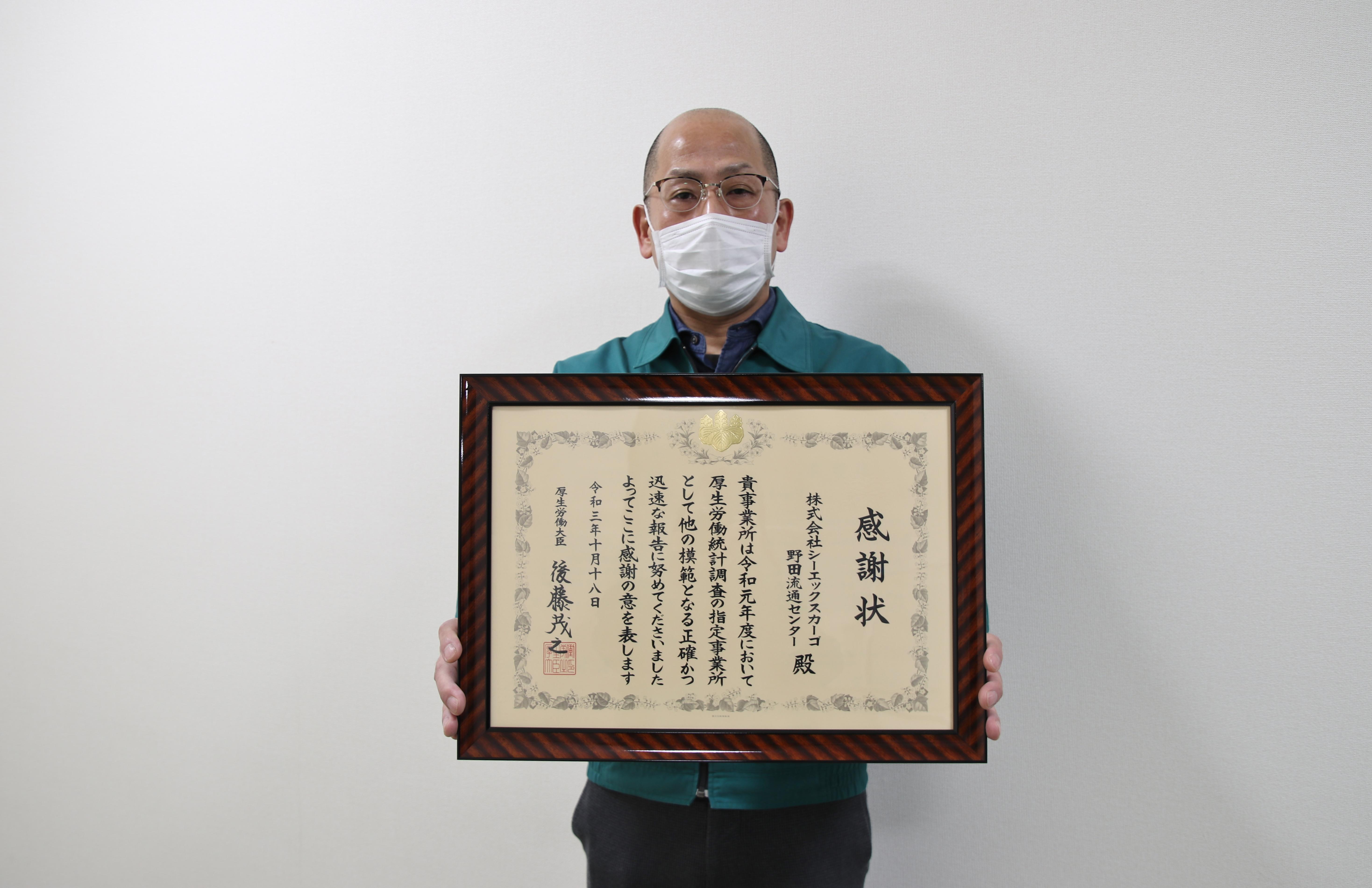 野田流通センターが、「令和3年度 厚生労働統計功労者功績表彰」を受け、感謝状が贈呈されました。これは厚生労働省の各種統計調査の発展のために尽力し、その業績・成績が特に顕著な個人や事業所を表彰するもので、表彰対象者の功績をたたえ、調査業務の円滑な実施と統計調査従事者の士気の高揚を図る目的で行われています。