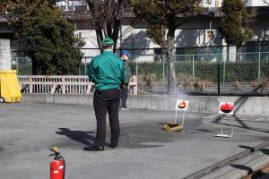 館内放送による火災発生連絡と、避難指示の訓練をはじめとして、避難後には消火訓練も実施しました。防災隊隊長からは、「日常から消火栓の位置の確認などを行い、いざという時に備えることが重要です」と、日頃からの心得などの話がありました。