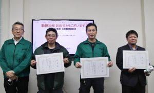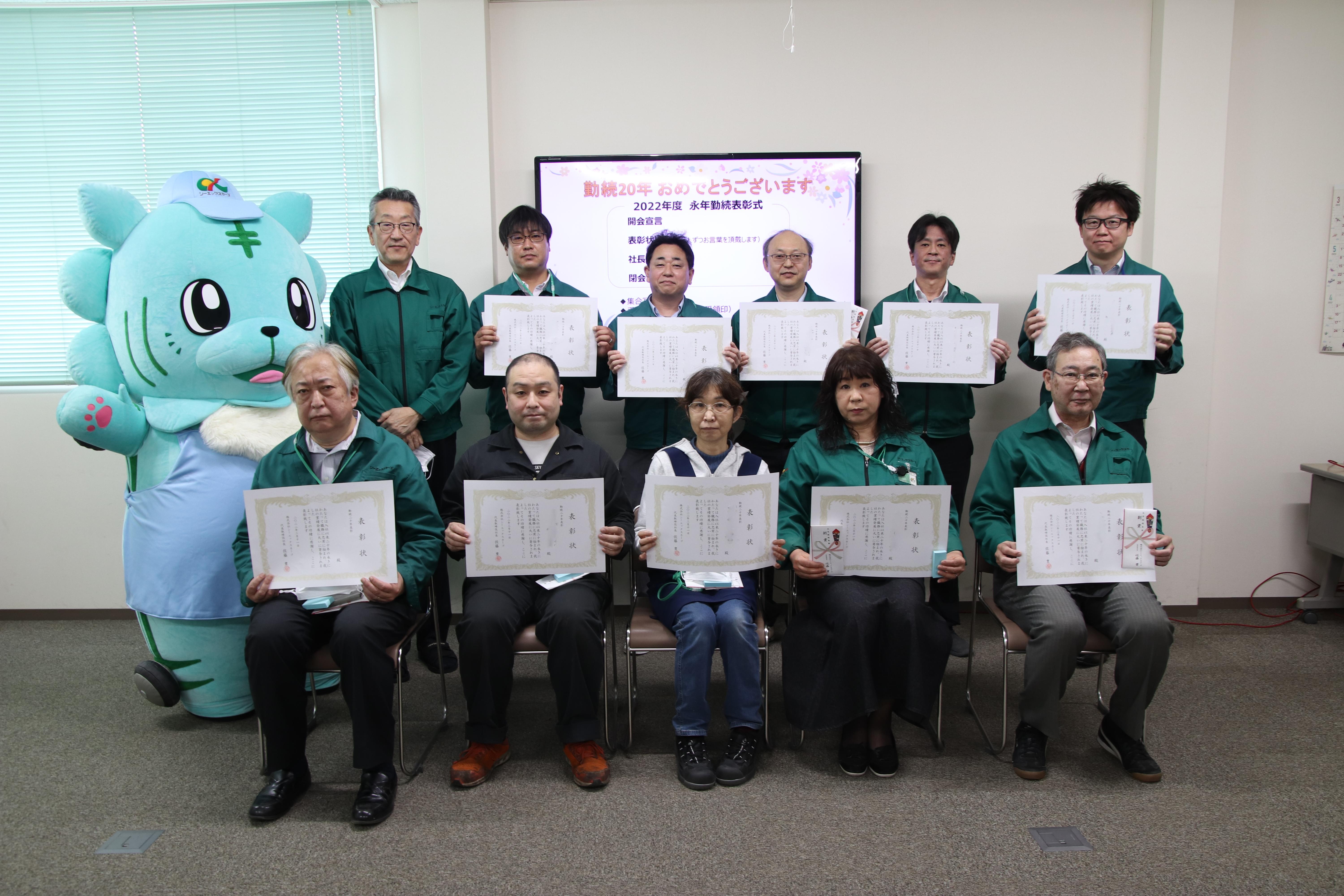 当社では、毎年3月11日を表彰基準日とした永年勤続表彰を行っています。10年表彰者には社内顕彰、20 年表彰者には表彰状と特別休暇、副賞が与えられます。今年の10年表彰者は129人、20年表彰者は59人が対象となりました。これに伴い、永年勤続20年表彰式が各事業所にて執り行われています。