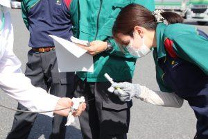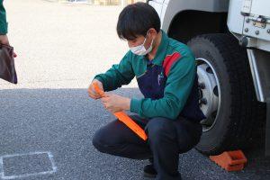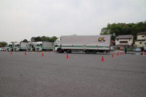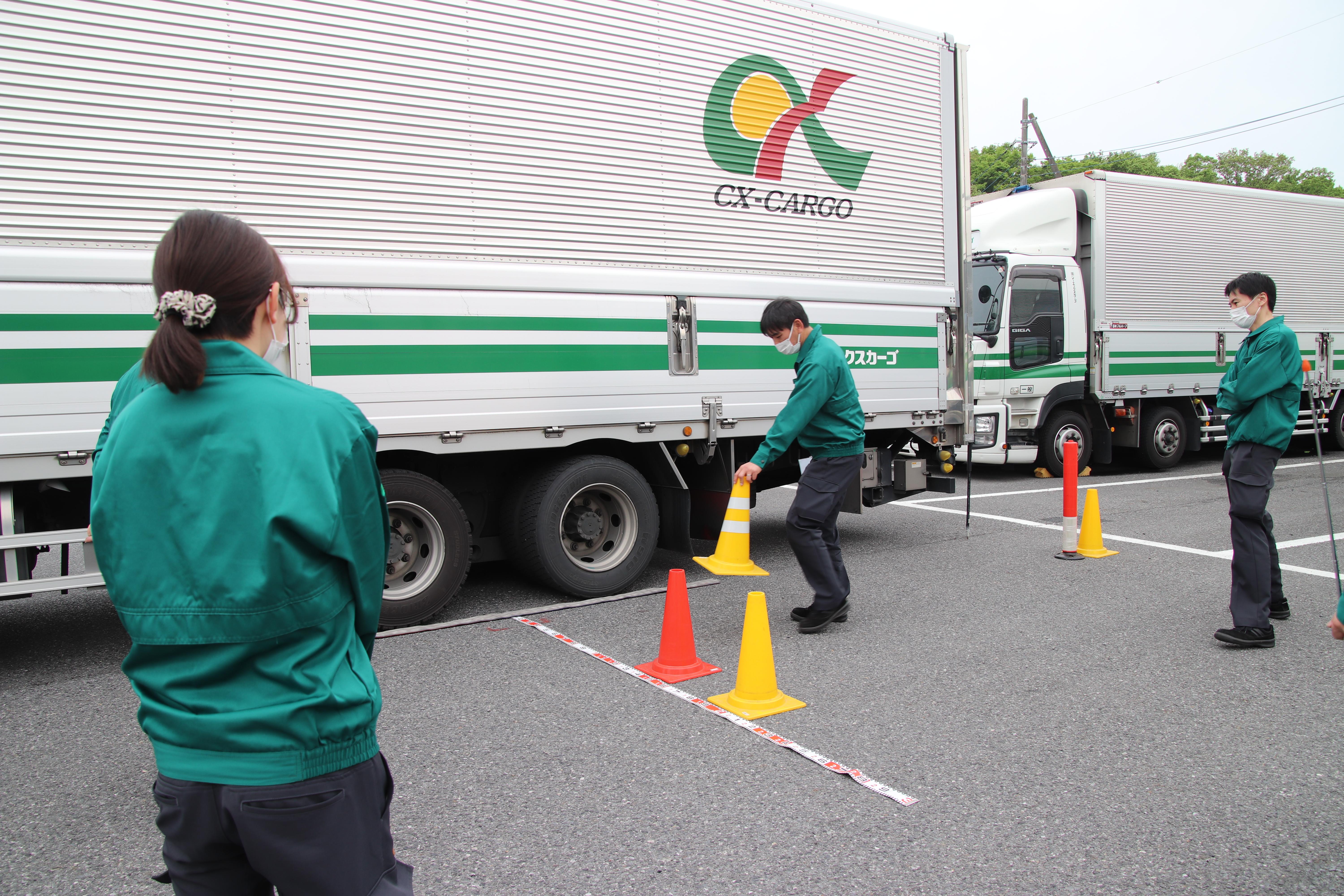 初日はアルコールの影響や法律の遵守、プロとしてのマナーなどの「トラックドライバーの心構え」の座学と、オーバーハング・死角など車両の構造や特性を学ぶ実技を行いました。また、今回の講習から新たに「たこつぼ(たこつぼ型で出入り口が1カ所。狭い場所での方向転換や切り返し練習を行う)」が加わり、受講者たちは皆真剣な表情で取り組んでいました。