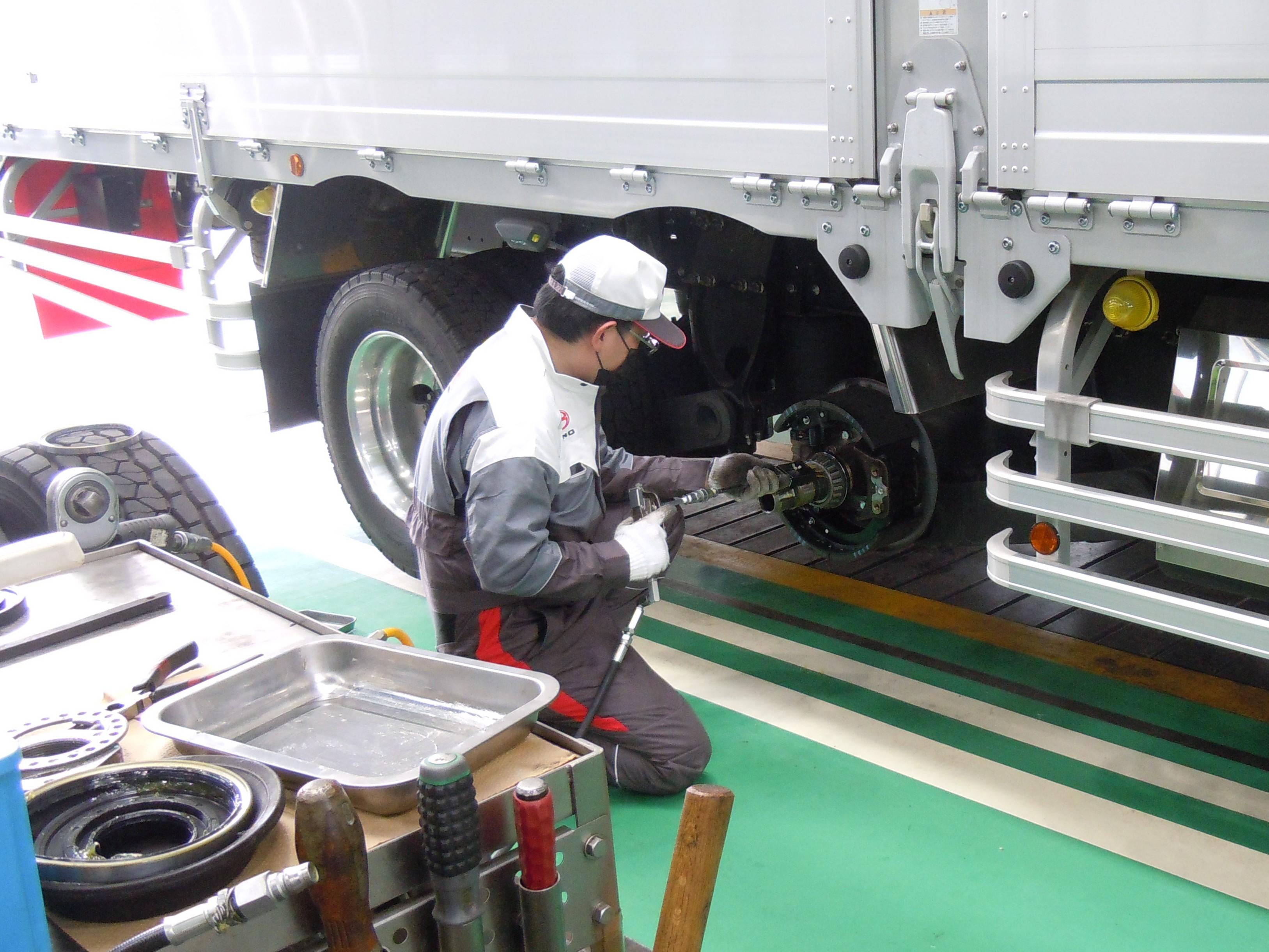 研修では、分解整備を伴う12カ月点検の「車検整備」、3カ月おきに行う「点検整備」、故障診断機(スキャンツール)を使用したトラブルシューティング、車両故障における修理工程の技能習得を学んでいます。