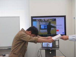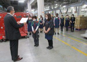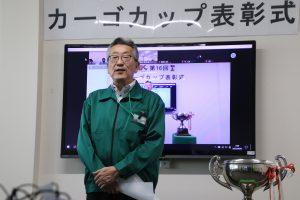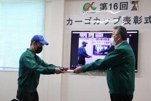 第16回カーゴカップ最優秀賞に輝いたチームは、直接本社の会場にてお祝いの言葉と共に、表彰状・カップ・目録が贈呈されました。贈呈時には社長より「コロナ禍の中、事業の活動、カーゴカップの取り組みを進めてきた社員の皆さんに感謝しています。年々レベルが上がり、班をまたいで手を取り合い進化させていくチームが目立っており、改善に終わりはないと感じさせられました。皆さんを見て、どんな困難にも立ち向かい打ち勝てる会社になってきていると感じています。」と、社員へ感謝と期待を伝えました。