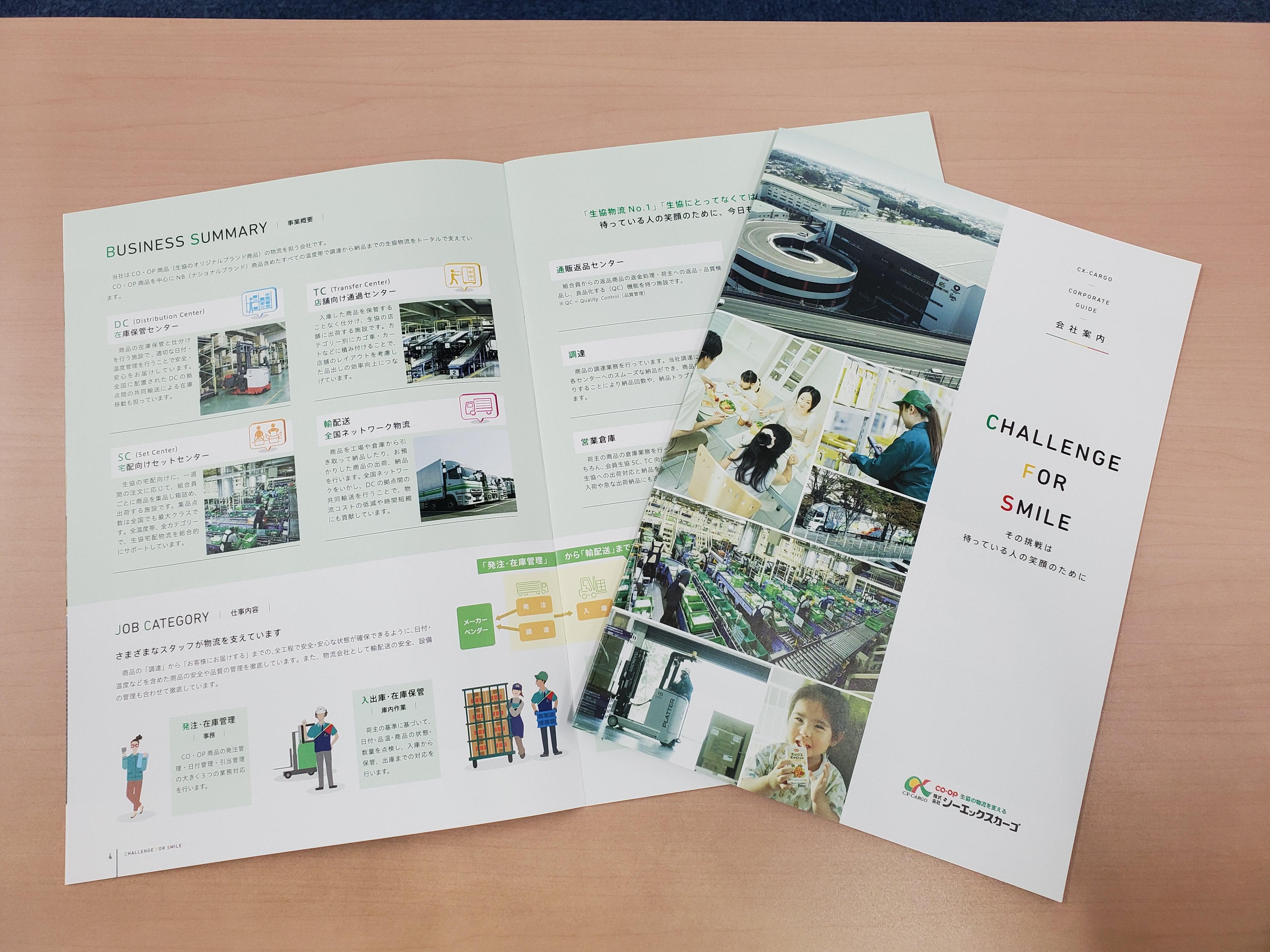 冊子は「CHALLENGE FOR SMILE その挑戦は 待っている人の笑顔のために」をテーマとした全12ページ構成で、コーポレートカラーのグリーンを基調とした作りとなっています。経営理念・ビジョンやトップメッセージ、事業・会社概要に加え、活躍している若手社員からのメッセージや、共育制度・ダイバーシティなどの当社の特色をまとめています。生協物流の「これから」を共に支える方の応募をお待ちしています。