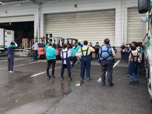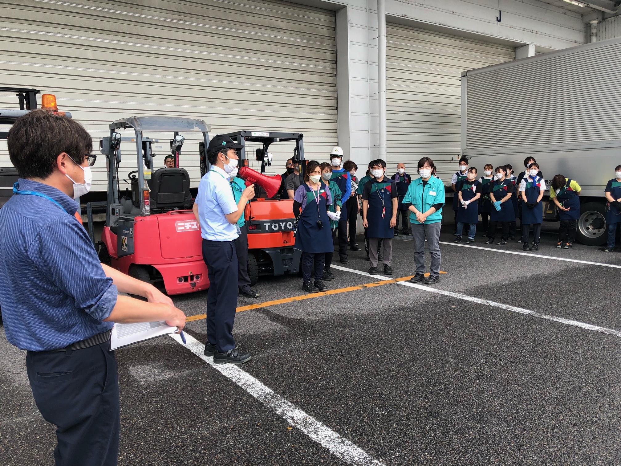 8月25日(木)、小牧営業所でトランコム株式会社(同敷地内:以下、トランコム)と合同避難訓練を実施しました。庫内2階のトランコム敷地内にある端材置き場からの火災発生を想定しての訓練となりました。参加した40人の社員は、トランコムとの共有階段2カ所から、それぞれ順に慌てずに行動・移動をすることができました。