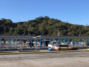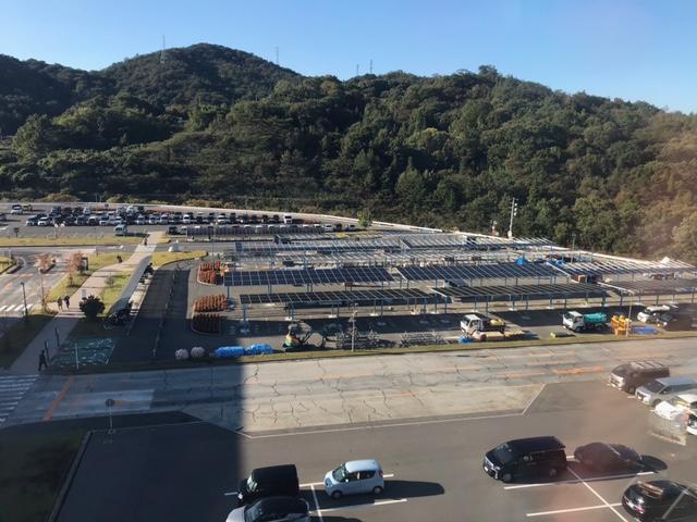 センターの駐車場にカーポート状のソーラー発電設備を設置するこの事業は、建築面積4,908.32㎡、年間発電量(見込み)1,184,691Kwh/年となり、環境省からの補助金を受け建設中です。