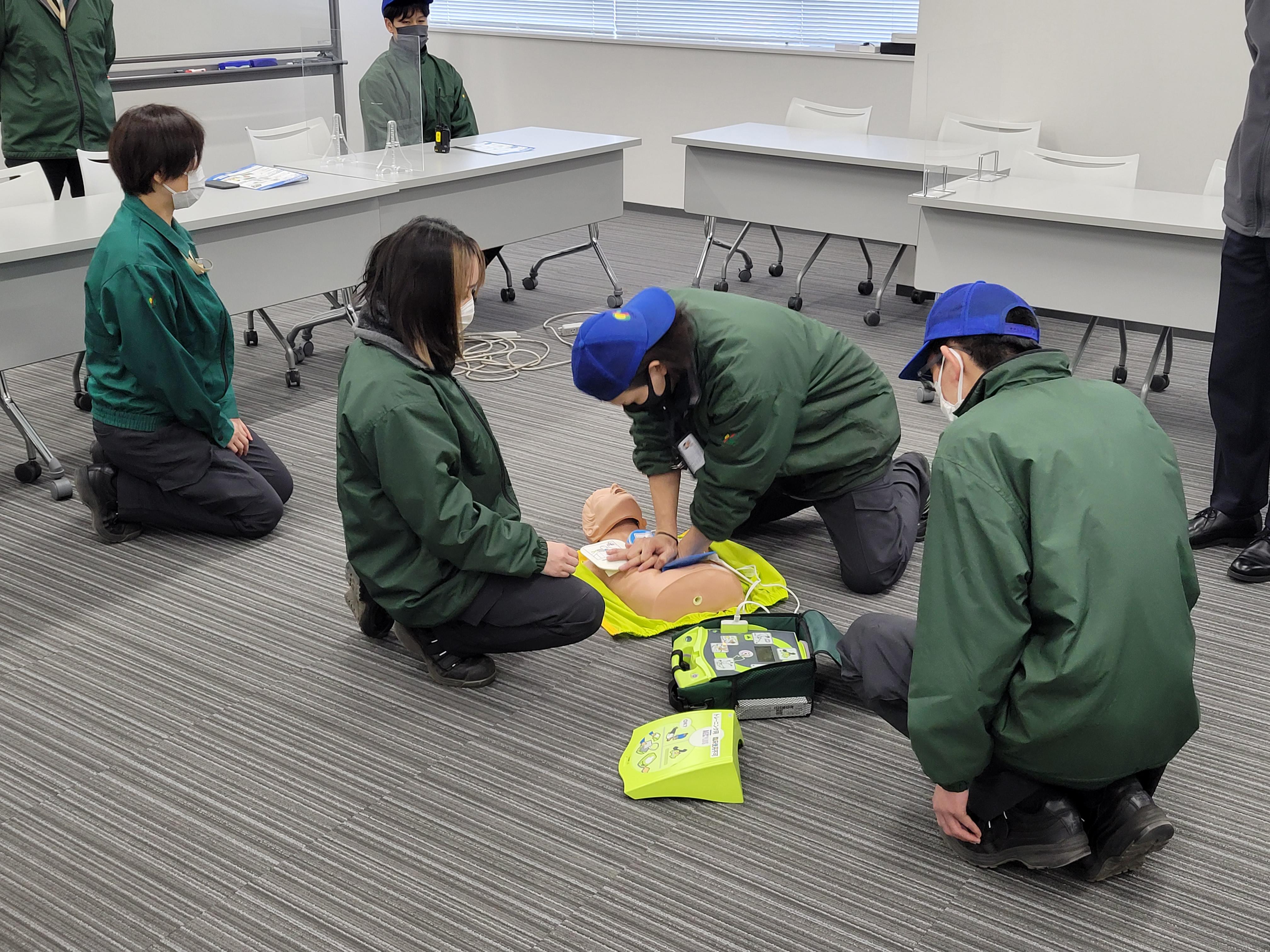 当日は消防隊編成の救出救護班7人を対象に、ミドリ安全埼玉西株式会社様を通じて、旭化成ゾールメディカル株式会社の方を講師に招き講習を行いました。初めに講師より救護の流れ、AEDの使用方法などの説明の後、人形を救護対象者に見立てて実施しました。講習にはセンター長も参加し、4人2班に分かれて、救護者への声掛けや胸骨圧迫・交代要員・AEDを持ってくるなど、役割分担をしながら学びました。