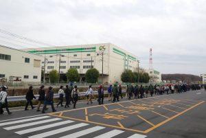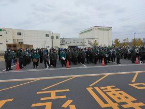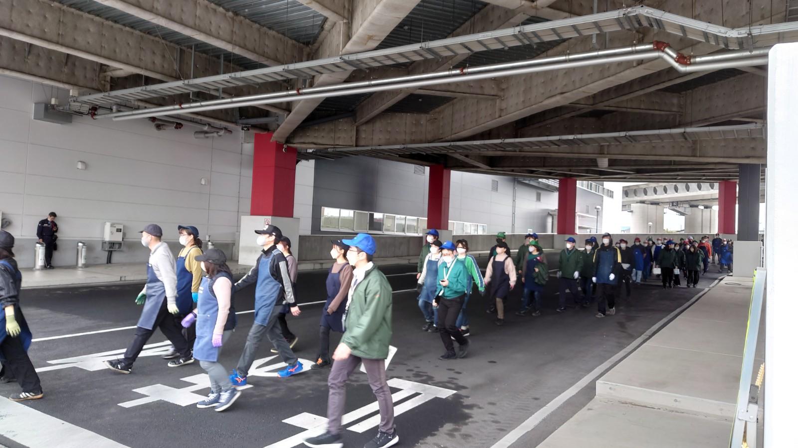 2月24日(金)、桶川第2流通センターにて、センター全体としては初めての避難訓練を実施しました。参加した社員は約350人で、火災を想定しての訓練で、煙の充満や一酸化炭素中毒のリスクが低いランプウェイを避難経路に設定し、火災発生から状況確認、避難案内、避難誘導、消防連絡、集合、点呼という流れで行いました。