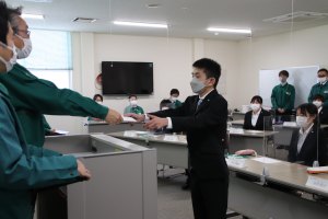 また、社長からは「これから仕事をしていく上で、悔しい思いをすることもたくさんあると思いますが、災害時に被災者・消費者からたくさんの”ありがとう”の声をいただけたりと、物流は生活に必要なインフラです。物流ビジネスをしっかり学び、自分の成長を喜べるようにしてください。失敗しても、上司・同期・同僚に救われると思います。そうして学びを知恵に変えていってください。当社に関わる全ての人に、”シーエックスカーゴがあってよかった”と言われる会社を作り上げていきます。皆さんのフレッシュな考えが、会社に新しい風を吹き込み、会社がもう一段階高いステージへ踏み出す原動力となっていただくよう期待しています。」と、歓迎の言葉がありました。