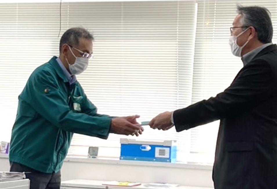 3月27日(月)、尾道流通センターにて永年勤続20年表彰式を行いました。当日は社長が足を運び、直接、感謝の気持ちと表彰状を手渡しました。