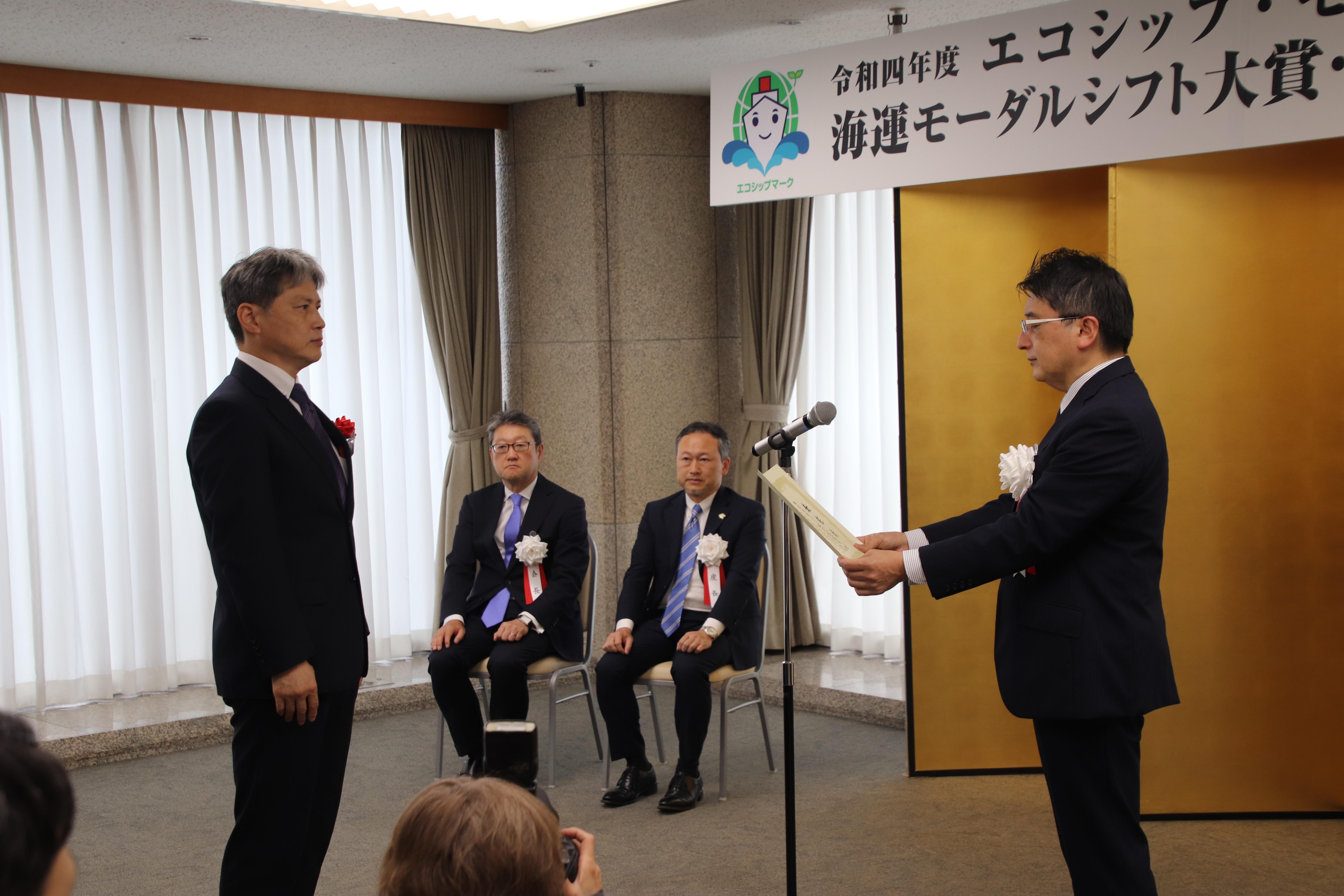 これを受けて神戸営業所の代表者が、5月26日(金)の優良事業者表彰式に参加しました。参加した社員からは、「海上輸送はCO₂削減はもちろんのこと、乗務員の負荷軽減(休憩時間の確保)にもつながり、24年問題対応にも有効です。今回の表彰を機に、さらに利用拡大を検討していきます」との声がありました。