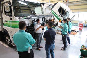 研修ではまず、今年開設した関東整備工場で実車を用いて日常点検の方法を学びました。さらに、整備課長が車両不具合を早期発見するための知識として、➀新ISOホイール、➁エアー系統の確認、③エンジンオイルの管理、④バッテリーの点検について講義しました。参加者からは質問も上がり、整備士と直接話をする機会もあり、多くを学ぶ機会になりました。