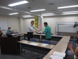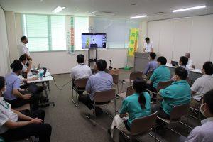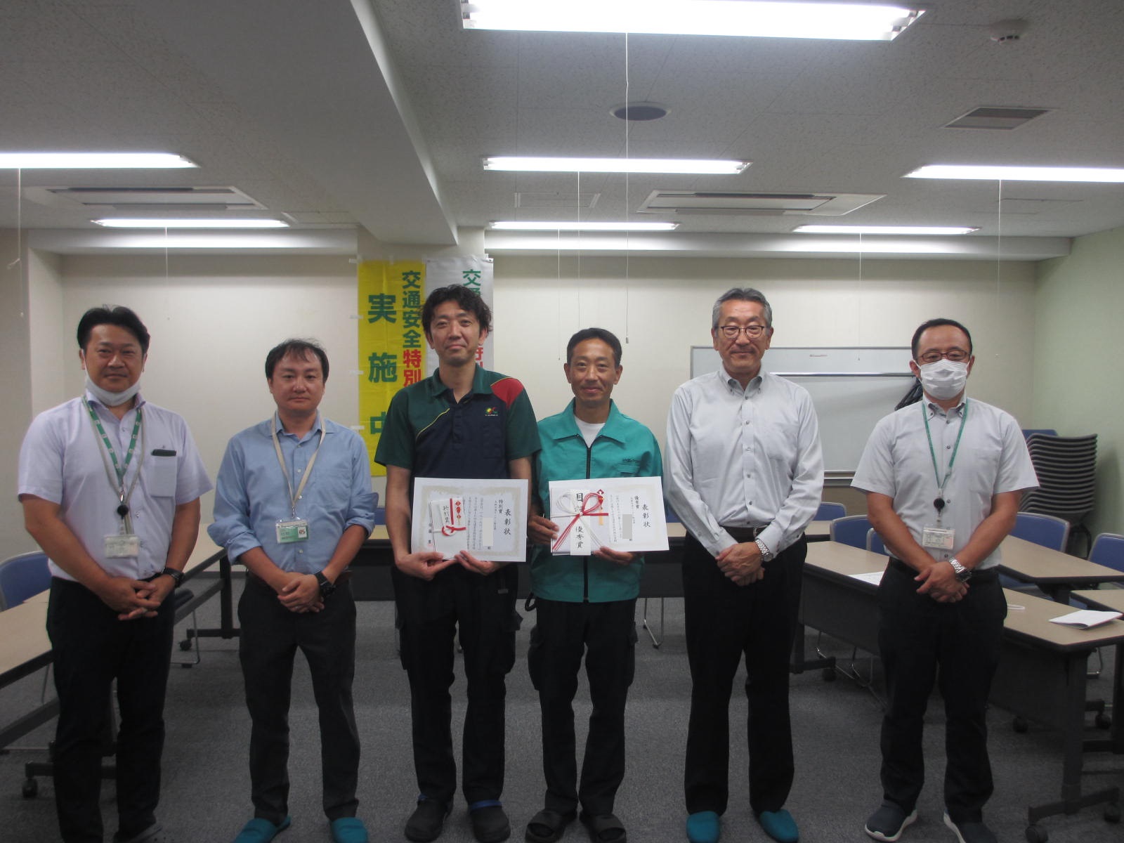 毎年、当社で実施している交通安全特別強化月間の取り組みの一環として、全社員に交通安全への意識を改めて持ってもらうため、社内で交通安全標語の公募を行いました。応募総数930作品の中から、優秀賞1作品、特別賞10作品の計11作品が入賞しました。9月12日(火)、本社と営業所をリモートでつないで表彰式を行い、優秀賞を受賞した社員へは社長より直接表彰状が授与されました。