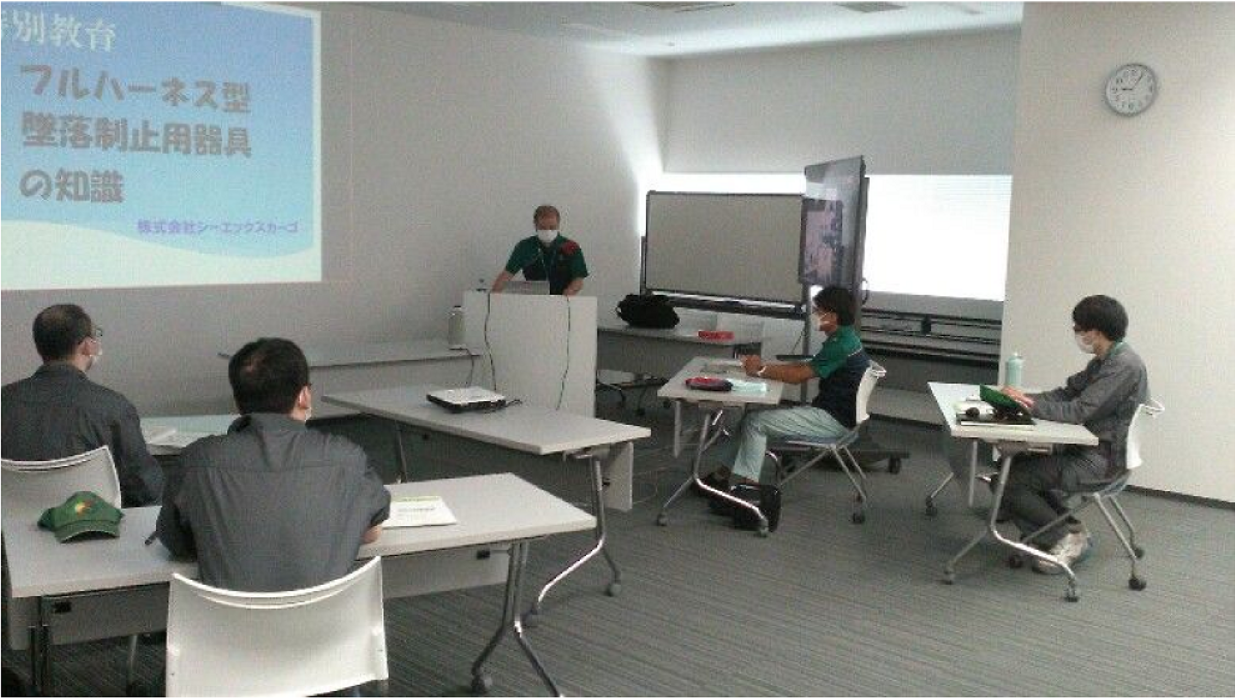 法令により、床からの高さが6.75mを越える場所で作業を行う全ての作業者に、フルハーネス型の墜落制止用器具の装着が義務化され、該当する作業者には「学科」と「実技」合計6時間の「特別教育」の受講が義務付けられています。そのため、全国の自動倉庫を保有する事業所・高所作業を行う設備課より計14人が参加し、うち10人はWebでつないで受講しました。