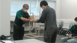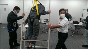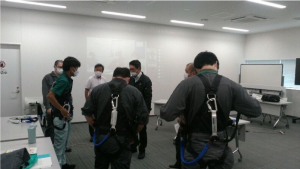 実技指導については外部講師を招いて実施し、各事業所での装着と、代表の2人が胴ベルト型・フルハーネス型両方でのぶら下がり体験を行いました。