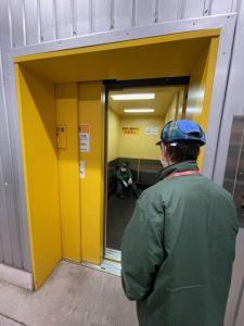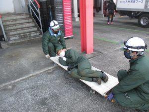 庫内でけが人が発生し、エレベーターに1人が閉じ込められたという想定で行い、担架での搬送も実施しました。避難後の点呼や集合の仕方についての再確認、担架での搬送の大変さの実感、作業場で身の安全を確保できる場所の確認など、収穫の多い訓練となりました。