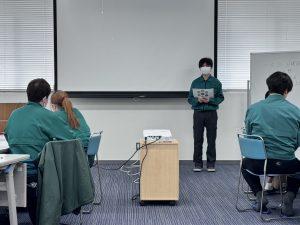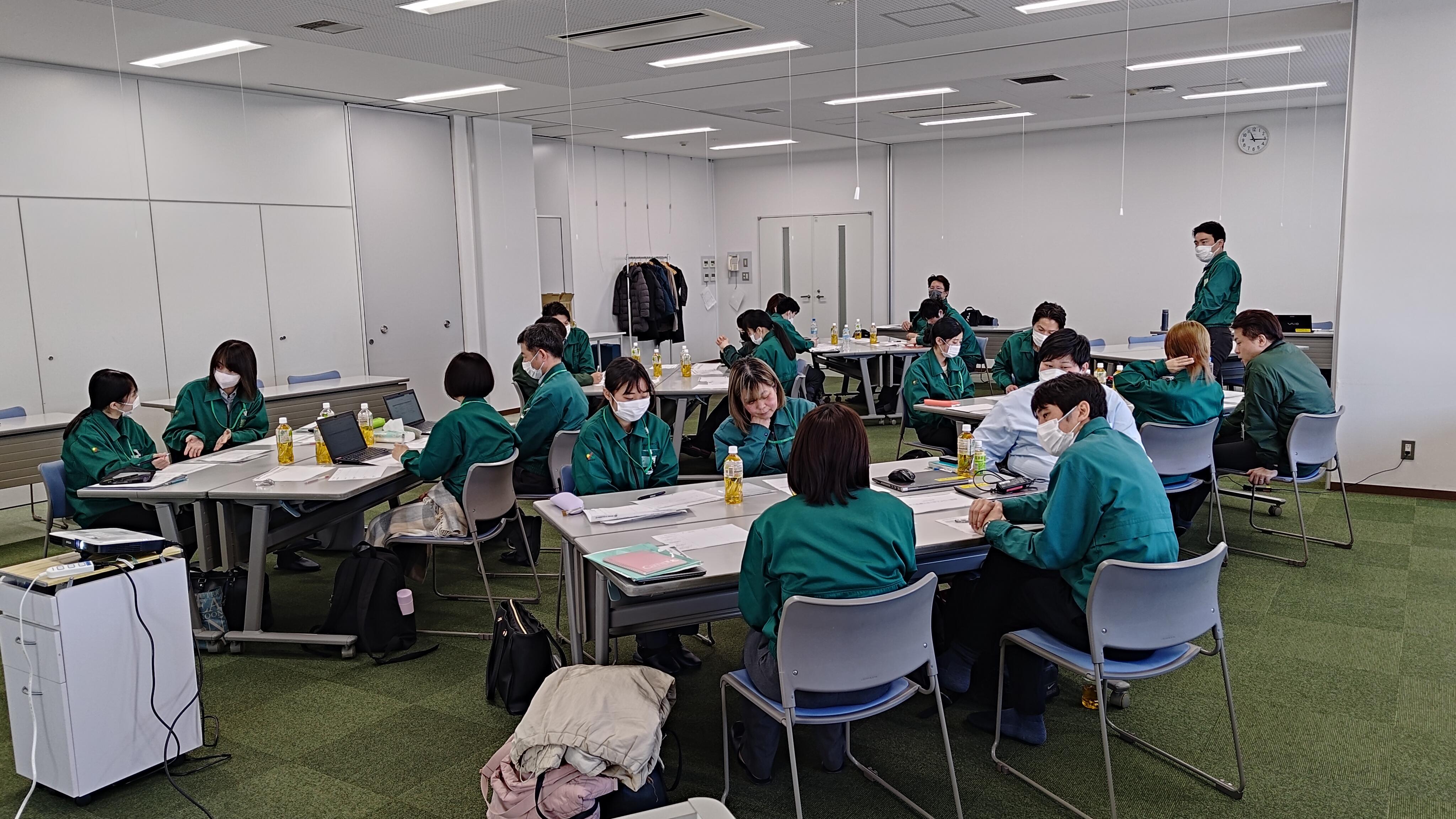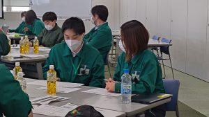 研修では、1年目の社員に対して上司である主任も同席し、共に1年を振り返るペアワークや、若手からベテランの先輩社員の経験談を聴き今後の自分を考える個人ワークやグループワークなどを行い、最後に3年目の自分をイメージした目標設定をしてもらい、1人ずつ発表しました。