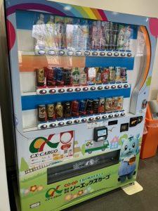 尾道流通センターでは、ES向上の一つの取り組みとして、シーエックスカーゴのカラーリングがされた自動販売機を新たに導入しました。この自動販売機はボタンを押すとランダムで何種類かのメッセージが流れる仕様になっており、購入者へのささやかな楽しみを提供しています。また、この自動販売機は、季節によっては熱中症注意喚起などのメッセージに変えられる設定になっています。