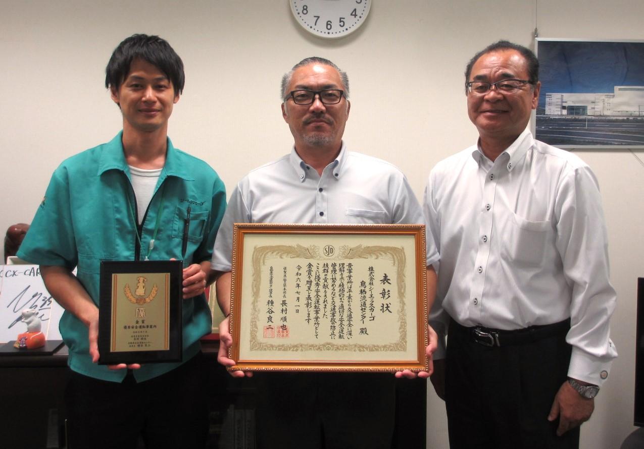 7月12日(金)、自動車安全運転センター所長と課長が鳥栖流通センターに来社され、「優秀安全運転事業所」として鳥栖流通センター輸送課が「金賞」を受賞しました。鳥栖輸送課はこれまでも銀賞、金賞、プラチナ賞を受賞しており、今回が7回目の受賞となりました。
