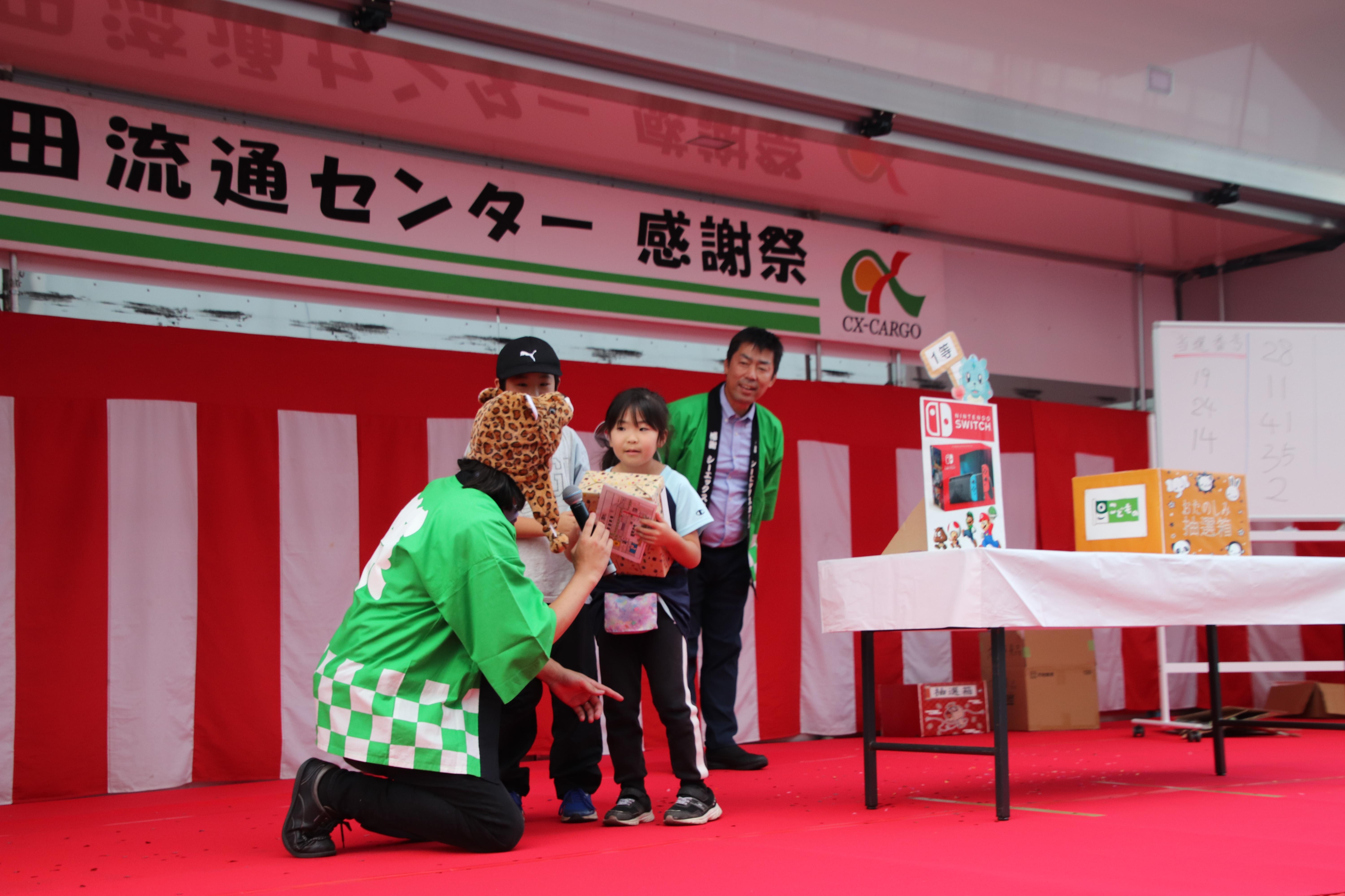 当日は約500人が来場して、○×クイズ、部署対抗勝負、子供向け・大人向けのお楽しみ大抽選会などが催されました。小学生以下の子供を対象にした大抽選会や子供向けのお菓子釣りゲームなどもあり、子どもたちの笑顔があふれました。部署別対抗勝負では風船の空気入れや腕立てなどで会場を盛り上げました。