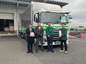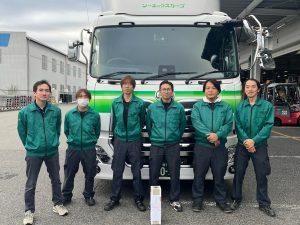 | 11月20日(水)、小牧営業所に約4年ぶりに大型トラックが納車されました。今回の車両は、ディスクブレーキが搭載されているため、乗用車のような止まり方が特徴となっています。また、ふらつき防止、ドライバーモニターなど安全運転支援装置が完備されています。 乗務員からは「フルキャブのおかげで、休憩がすごく楽になった」「新しい車両に乗務すると、より安全意識が向上する」といった声がありました。管理者からは「乗務員が車内での休憩時に、シートをリクライニングして身体を伸ばせるように、フルキャブを選択していた。期待通りフルキャブを喜んでもらえてよかった」といった声がありました。 当社の今年度の新車は24台納車予定です。これからも、シーエックスカーゴは組合員のために安全・安心なコープ商品を、安全・安心に配送していきます。 |