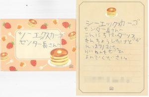 11月16日(土)に、姶良冷蔵流通センターの感謝祭に参加された日本労働者協同組合連合会センター事業団より、当社の姶良冷蔵流通センター長と社長にお礼状をいただきました。姶良の感謝祭には、当団体の皆さんを第1回(コロナ禍は除く)から招待しており、今回は大人と子ども合わせて89人の方々にご参加いただきました。当日は、日本労働者協同組合連合会センター事業団と業務連携をされている「姶良地域福祉事業所 児童デイサービスおひさま」の子どもたちに可愛いダンスを披露してもらっています。今回いただいたお礼状の中には、子どもたちからのお手紙や写真も入っており、とても楽しかったという言葉が添えられていました。