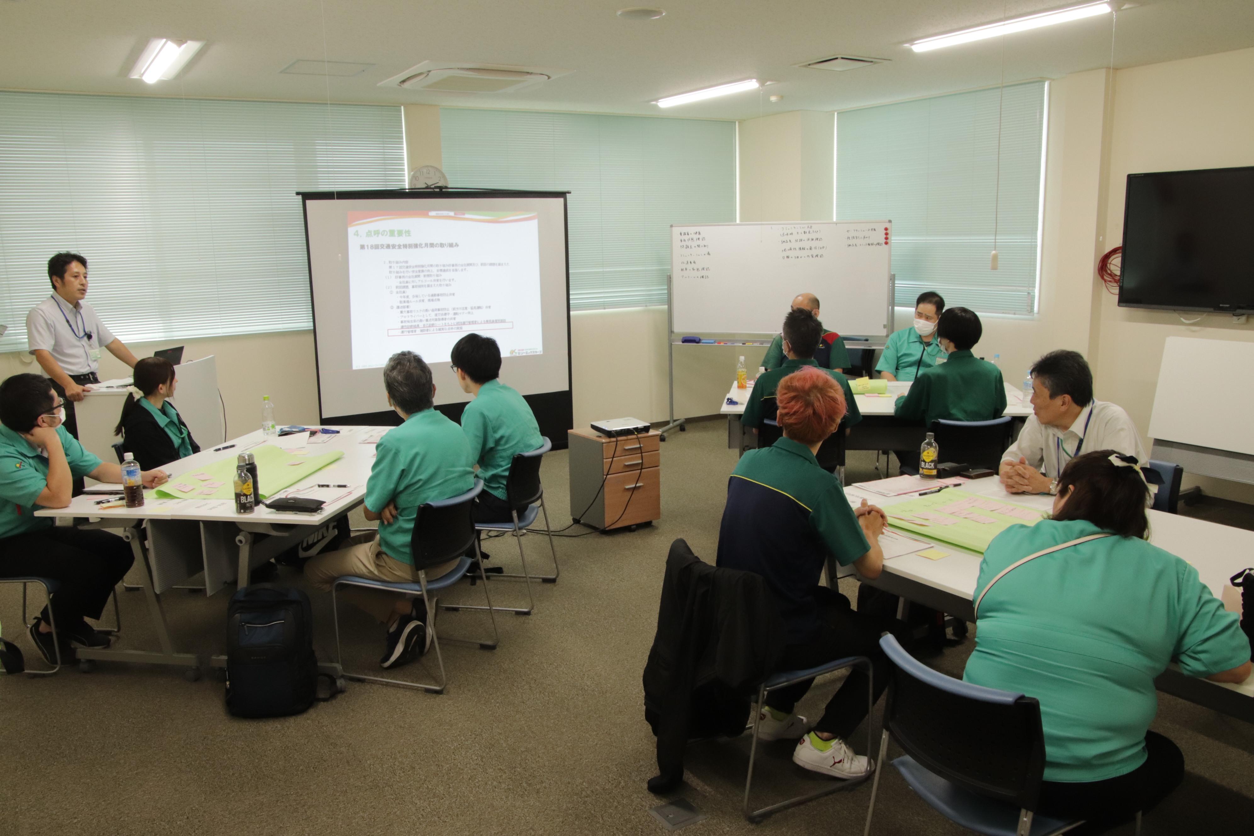 7月17日(木)、本社にて第2回運行管理者研修を実施しました。この研修は、全国の営業所にいる運行管理者11人を対象に行われ、「1.運行管理者の業務・役割について再確認する。2.車両事故発生時の原因と対策についてをグループワークを通して確認する。3.点呼の重要性・標準的な点呼、点呼のロールプレイングを通して点呼を学ぶ。4.交通安全特別強化月間取り組みの『確実な点呼の実施』について協議、取り組み内容について策定する。」ことを目的に実施されました。