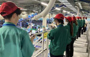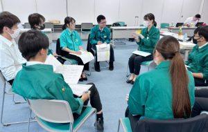 1日目は、社長講話や入社からの振り返り、先輩社員との交流で自身の成長イメージやありたい姿を考えました。2日目は、常務講話や尾道流通センターの見学、目標設定を行い決意表明をしました。決意表明では、取締役、支店長、所属長、課長、主任と研修会場をオンラインで繋ぎ、研修の感想や自身の理想の3年目像の発表を行いました。
