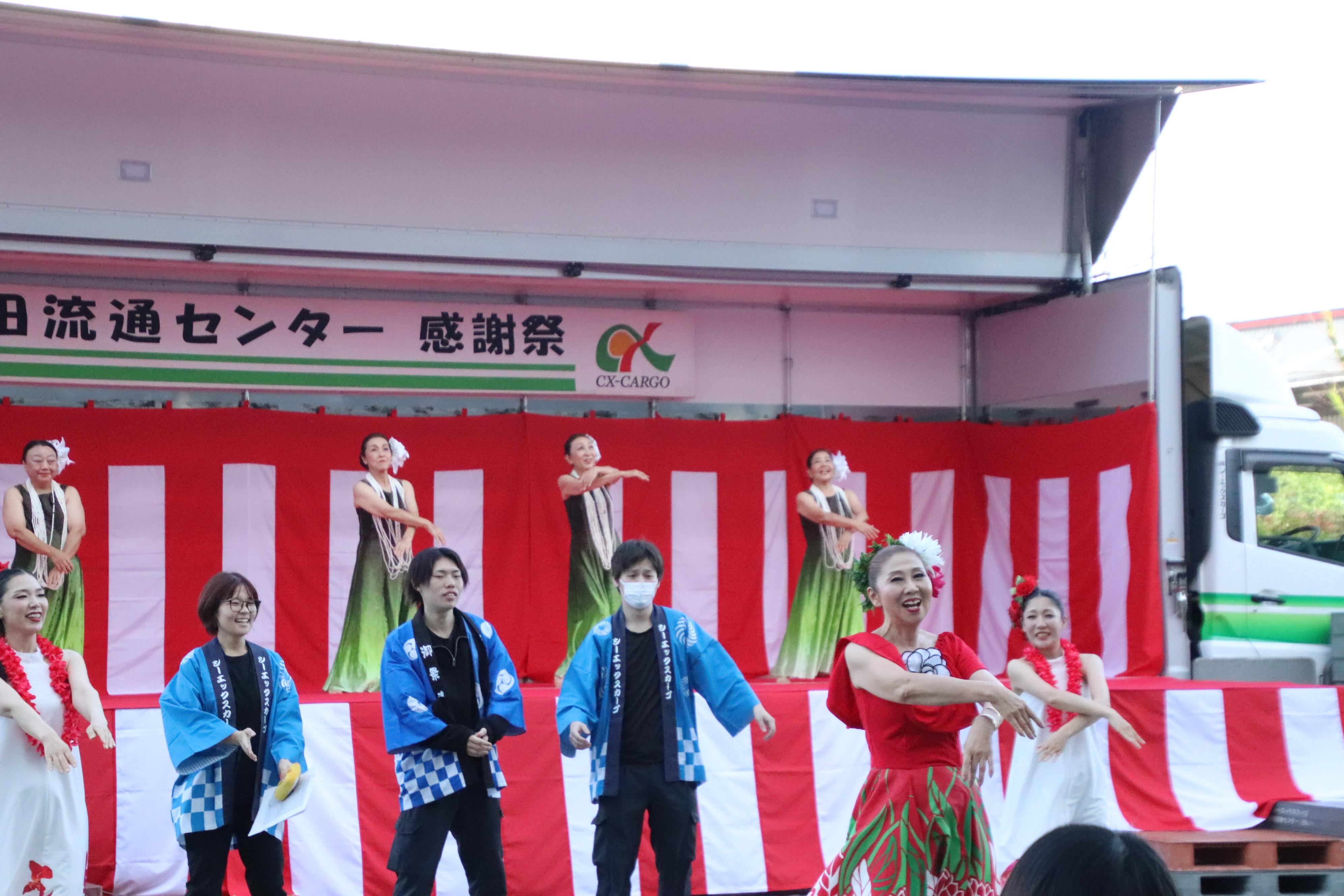 野田流通センターでの感謝祭には、社員とそのご家族、協力会社の方々など総勢約530人が来場しました。会場では、ネパール国籍の社員によるダンスや、ハーラウ・フラ・オ・プアロケの皆さんによる華やかなフラダンスが披露され、南国の雰囲気で会場を盛り上げました。 さらに、部署別対抗の早食い競争では、4種のメニューに挑戦する熱戦が繰り広げられ、笑いと歓声に包まれました。最後は子供と大人それぞれの抽選会が行われ、参加したお子さんからは「1等でうれしい!」という声も聞かれました。