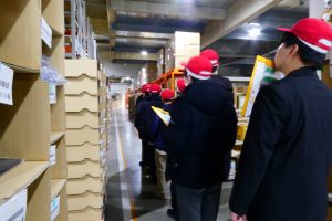 この交流会では、桶川第2流通センターのセンター見学や内定者交流、事業理解ワーク、キャリア紹介を行いました。1時間にわたるセンター見学では、在庫保管エリア・マルチシャトル・製函機・封函機など、センター内の多様な設備を間近で見ながら、商品の入庫から出庫までの流れを実際に目で見て学ぶことができました。昼食休憩では、共通点探しゲームを実施し、Aチーム・Bチームの2チームに分かれ、お互いの共通点を探しながら交流を深めました。