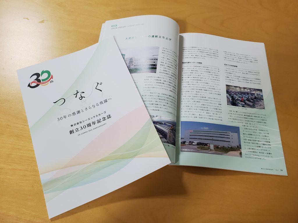 創立30周年の記念として、記念誌を発行しました。本誌はこれまでの当社の歴史などを振り返り、30年の感謝とさらなる飛躍を伝える内容となっています。これまで当社を支えてきた全社員と、荷主・協力会社へ配布を行っています。