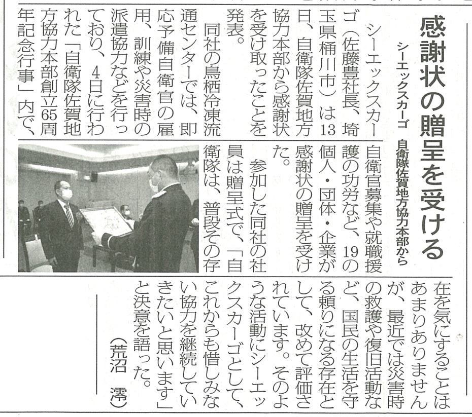 鳥栖冷凍流通センターが即応予備自衛官の雇用、訓練や災害時の派遣協力などを行い感謝状の贈呈を受けたことについて、新聞に取り上げられました。