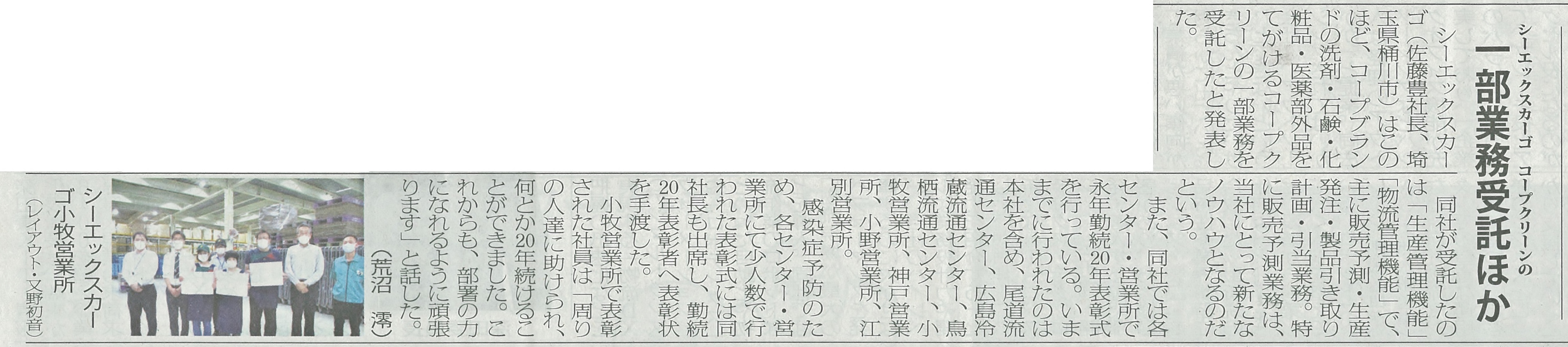 当社がコープクリーンの一部機能を受託したこと、永年勤続表彰について専門紙に取り上げられました。