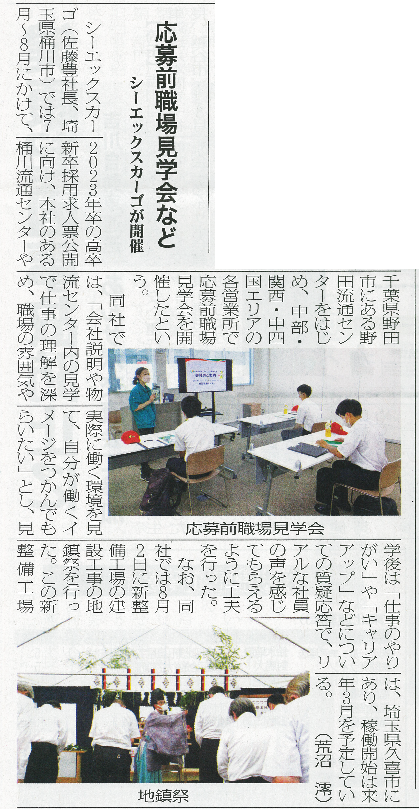 当社で開催した応募前職場見学会・新整備工場の地鎮祭について、新聞に取り上げられました。