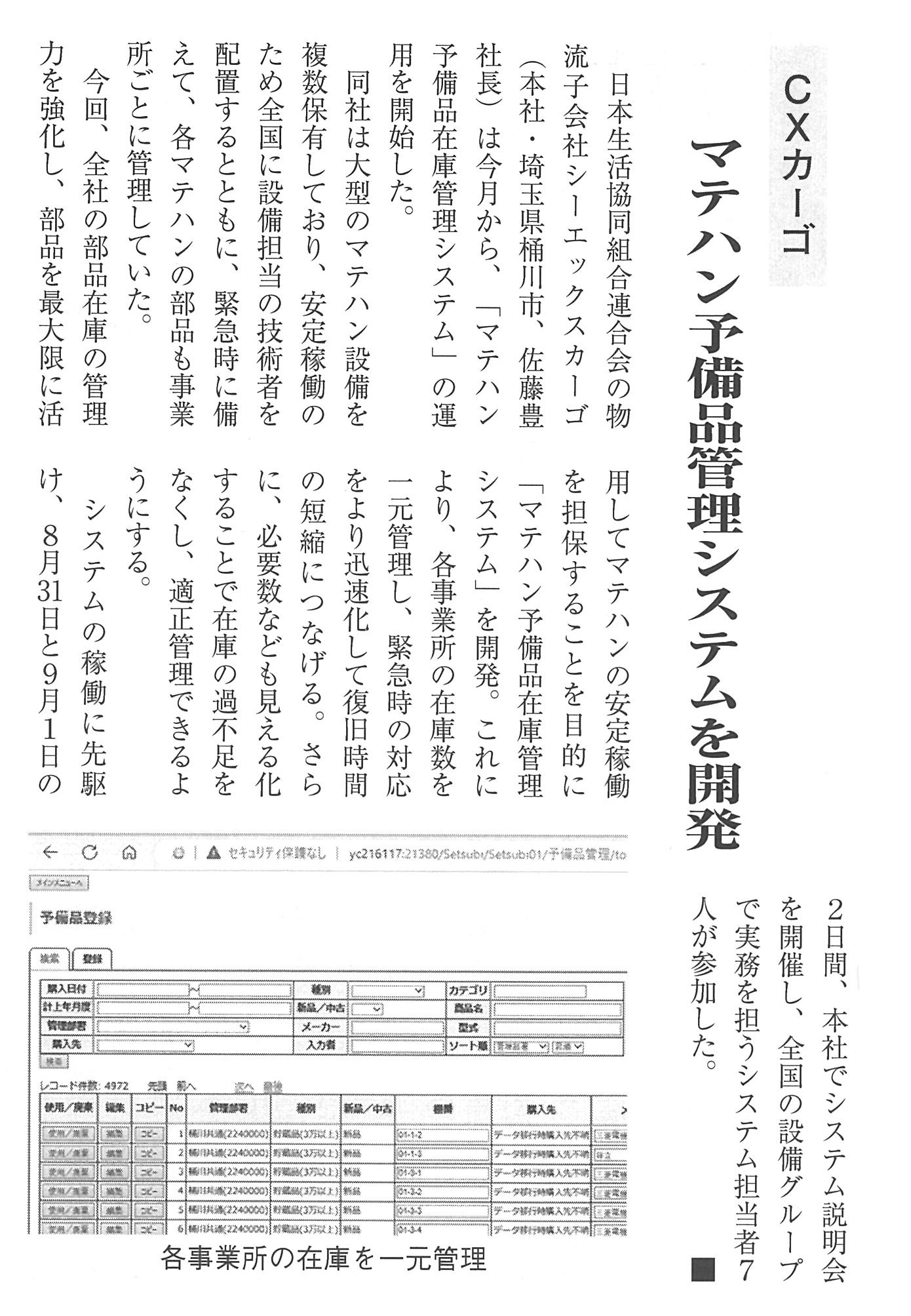 当社で導入したマテハン予備品管理システムについて、新聞に取り上げられました。