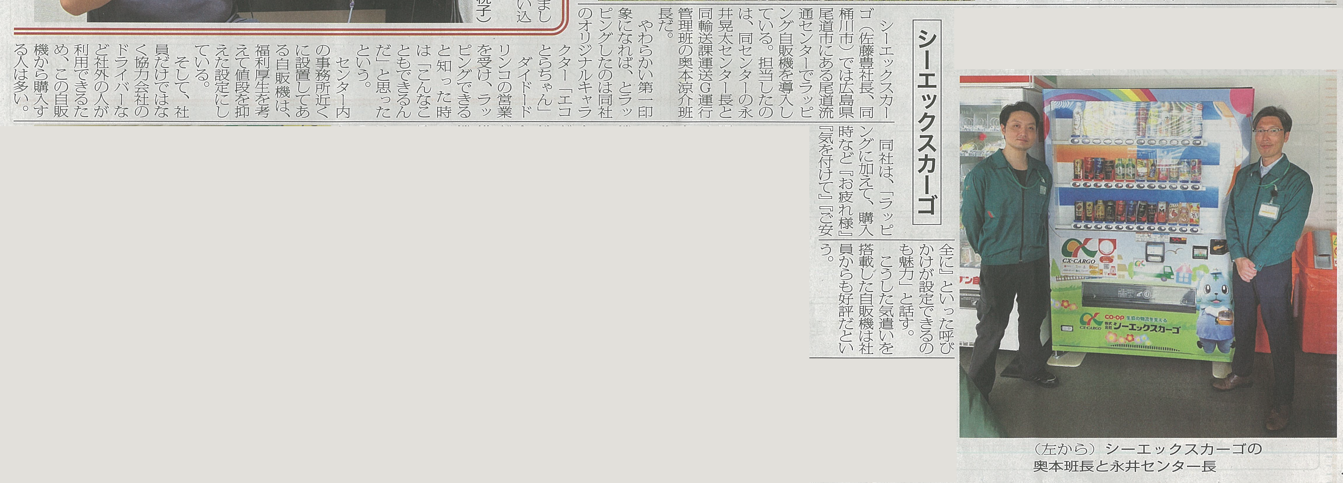 尾道流通センターに設置されているシーエックスカーゴのラッピング自販機について、新聞に取り上げられました。