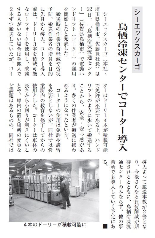 鳥栖冷凍流通センターでのコーター導入について、新聞に取り上げられました。