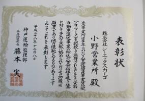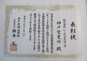 全日本トラック協会が認定するGマーク(安全性優良事業所認定)の10年継続を受け、神戸営業所と小野営業所が国土交通省 兵庫陸運部管内の神戸運輸監理部より表彰されました。 この表彰は、兵庫陸運部管内のGマーク認定されている事業所の中から「連続して10年以上Gマークの認定を取得していること」「荷主等から輸送の安全に係る評価を受けていること」など厳しい審査を経て選ばれるもので、今年は21の事業所が表彰されています。
