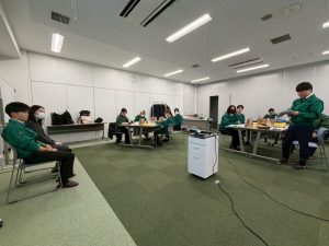 2日目はアイスブレイクとして昼食のお弁当決定権がかけられた事業概要クイズ大会が開かれ盛り上がりを見せました。その後、コミュニケーションについての座学や、先輩社員との交流を通じて仕事への理解を深めました。さらに研修の振り返りと「入社1年後のありたい姿」をテーマに目標設定を行い、取締役や各事業所のセンター長がWebで見守る中、決意表明を行い研修を締めくくりました。